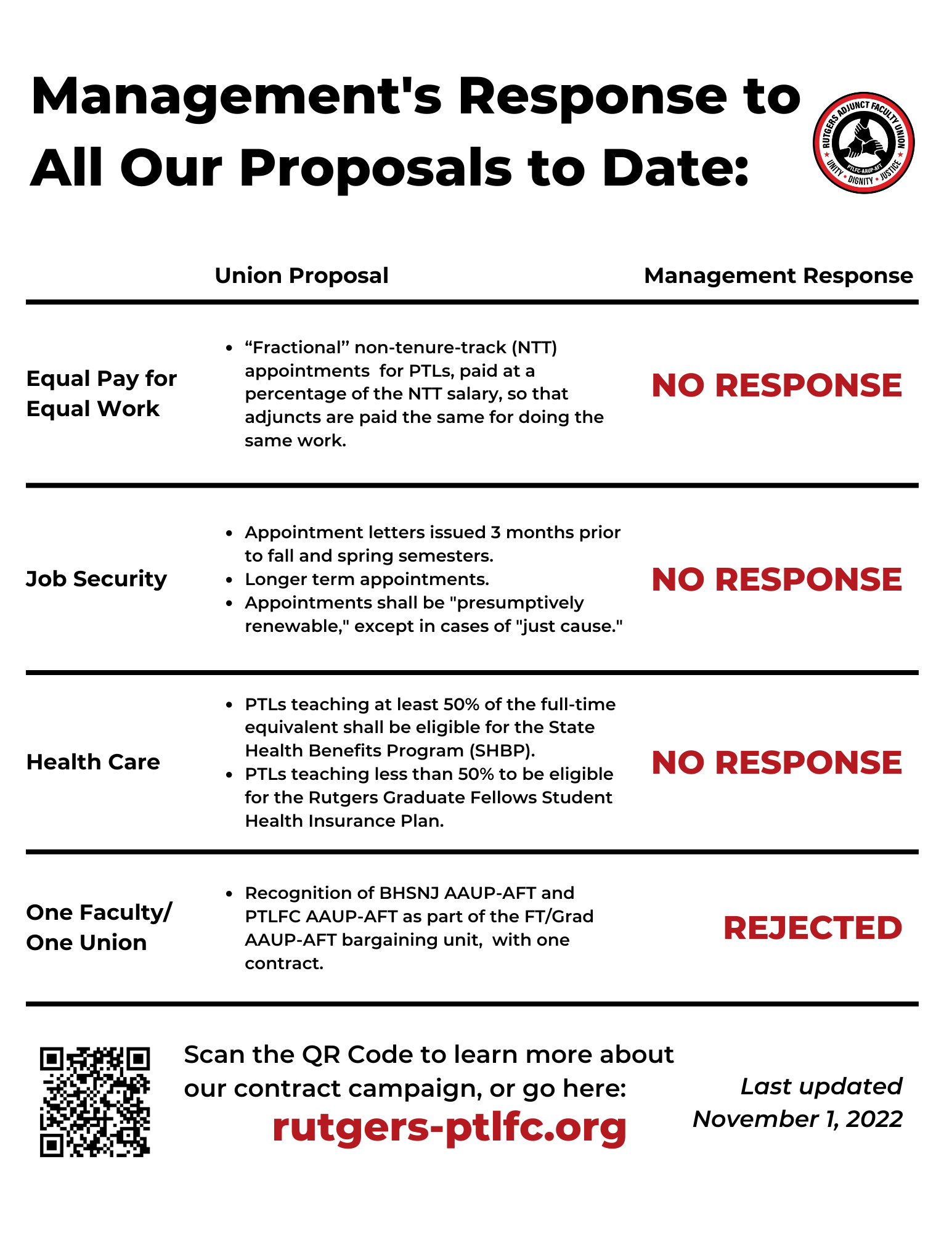Where do we now stand? All 3 faculty unions have been working closely together to insist on rules that maintain as much transparency, participation and openness in bargaining as possible. But we also want to get back to the table. So we proposed what we believe to be a fair compromise: rules that allow us to alternate between “large” (open to all union members) and “small” (roughly 20 of a core group of members) sessions. The good news? The administration responded positively to this general idea. The bad news? It insisted on capping both small and large sessions at numbers far too small to allow our members to have meaningful participation. Since management’s caps were arbitrary, we put together a counter-proposal with numbers that we believe will allow us to uphold the principle of democratic participation while also recognizing that we need to resume bargaining soon, and we’ll likely have to accede to some of management’s demands. We believe we are close to coming to an agreement, so please stay tuned for dates, times and how to sign-up to attend our large sessions!